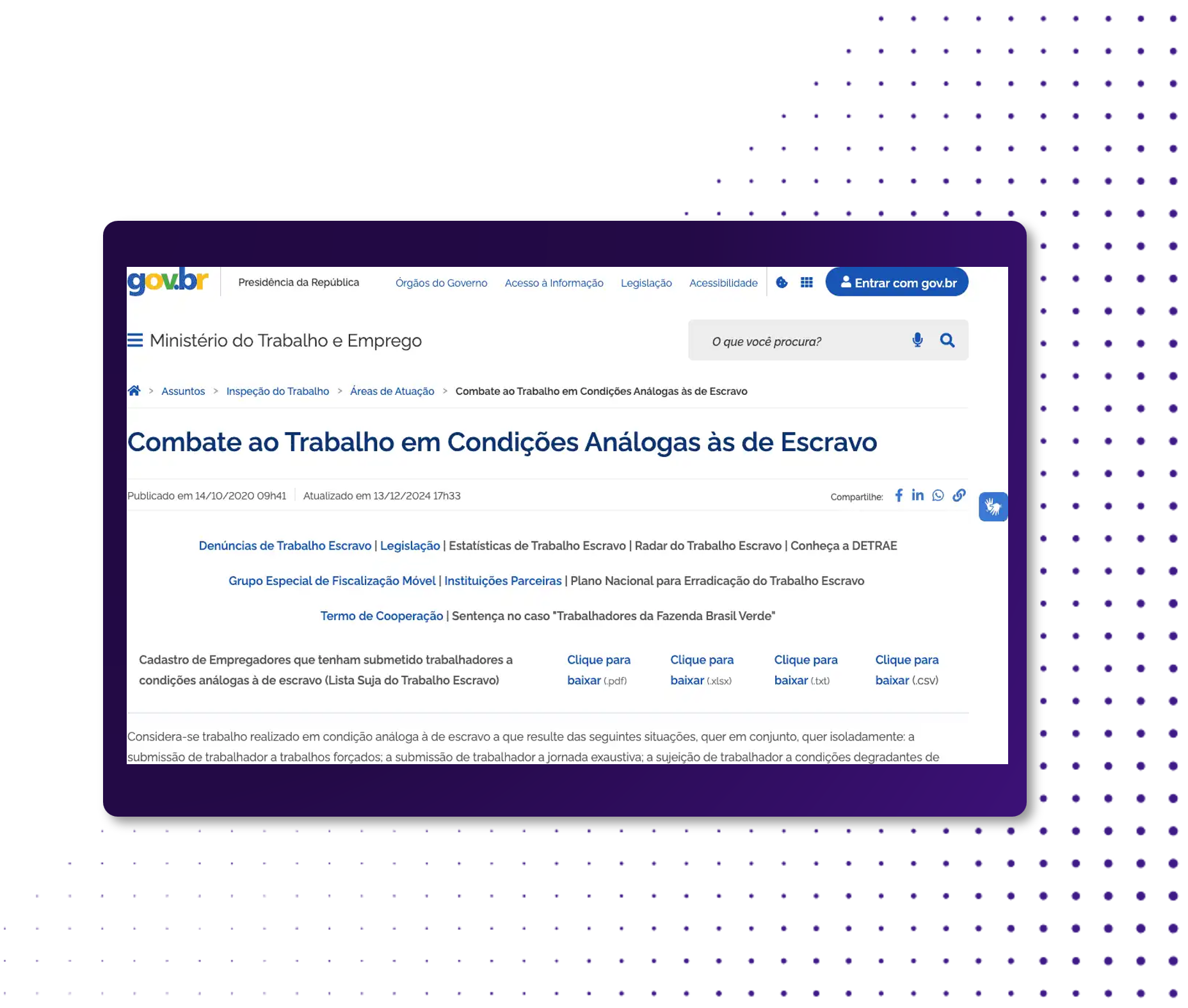 A API de Secretaria de Inspeção do Trabalho (Trabalho Escravo) possibilita verificar se uma empresa ou pessoa física consta no cadastro de empregadores que submeteram trabalhadores a condições análogas às de escravo.
