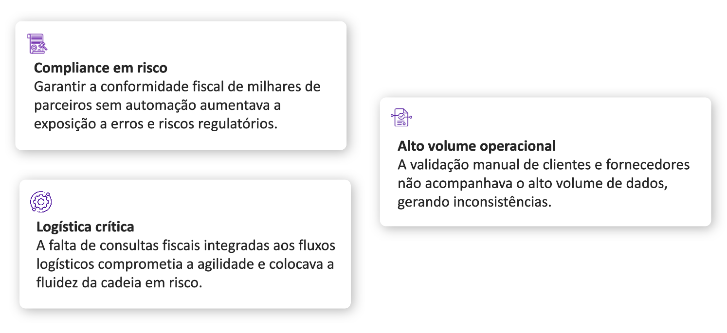 A empresa opera uma cadeia logística de elevada complexidade, envolvendo milhares de parceiros, fornecedores e transportadores, inserida em um ambiente regulatório rigoroso, o que demanda soluções robustas para assegurar o compliance fiscal.