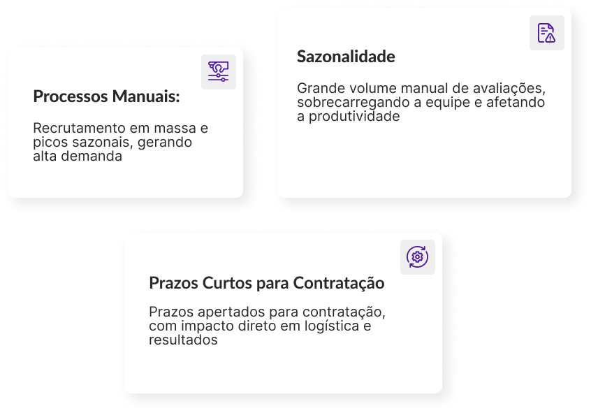 A operação da empresa enfrenta desafios no recrutamento em massa, especialmente durante picos sazonais. A alta demanda por contratações em grande volume, com milhares de candidatos sendo avaliados de forma manual, em pouco tempo, sobrecarregava o time.